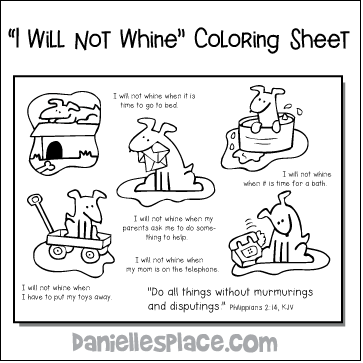 This dog-themed coloring sheet introduces children to relatable yet challenging situations that might spark their tendency to whine or complain. Brightly illustrated, it features playful puppies navigating a series of slightly frustrating antics, each encouraging a lesson in patience. At the bottom, a Bible verse from Philippians 2:14 serves to remind them to approach life’s challenges without whining, arguing, murmuring, or disputing. (Available in both KJV and NIV)