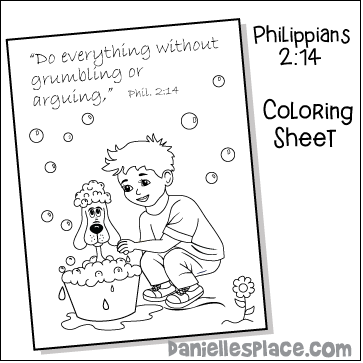 This coloring sheet serves as a joyful reminder for children to approach unpleasant tasks, such as taking a bath, with a positive attitude instead of whining or grumbling. The delightful illustration of a slightly disgruntled dog in a tub adds a playful touch to this important message. Coupled with the powerful Bible verse, "Do everything without grumbling or arguing," this activity encourages kids to embrace challenges with a cheerful spirit. Let's inspire our little ones to tackle their tasks with gratitude and enthusiasm!