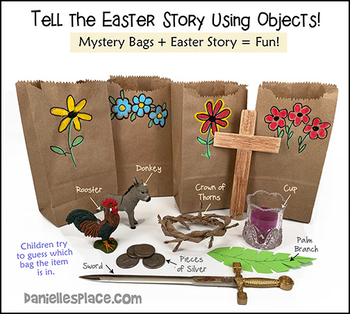 Here's a fun way to teach the Easter story using objects from the story. Children take turns trying gues which bag the next object in the lesson can be found and then read a Bible verse before trying to find the next object. To review, play a fun memory game. For more information, check out our Easter Object Lesson Page.