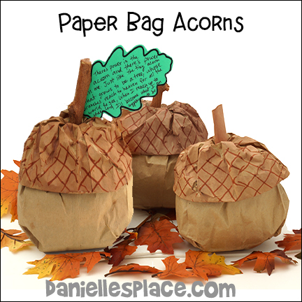 This is a great educational craft for home school projects. Use this craft with books about acorns or acorn unit studies. Have your children write poems on the leaves and attach them to their paper bag acorns. Display the acorns with silk oak leaves and paper bag squirrels.
