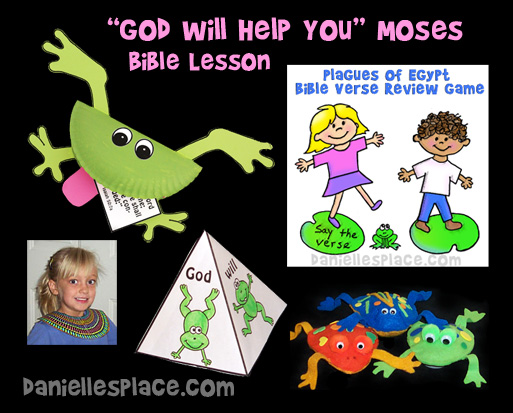 Children learn about Moses and the plagues of Egypt in "God Will Help You". They learn that God helped the Israelites escape from Egypt and he will help them. Using a frog theme, children can make a paper plate frog that hold's the memory verse in its mouth, a rock frog on a paper plate lily pad, or a Bible verse pyramid. They play "Pass the Frog" bean bag game, a musical chairs lily pad game, or find out what the Bible verse is by taking things out of Froggy's mouth. They will be amazed at the things Froggy has eaten, besides the words to the Bible verse.