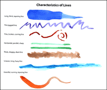 Lines can make us feel a certain way by the way they are drawn. They create emotions or feelings by their directions and character. Experiment with different media and tools to make lines with different characteristics. Chalk or pastels can make thick, fuzzy or blurry lines. Rub a little water over a magic marker line to make it fuzzy. Water and acrylic paint are great for making thick, tapering lines. Draw on a sheet of paper with a candle and then paint over the line with water color paint to make uneven choppy lines. Print out the line activity sheets or make up your own line descriptions.