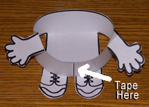 2. In class have your children color the patterns. When they are done coloring place a peach on top of the feet part of the pattern and fold up the back part. Bring the side up and around the peach as shown in the picture. Tape the two ends together in the front, over the feet part of the pattern, to make a circle.