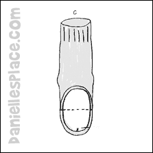 2. Introduzca la boca doblada dentro del calcetín para que la parte del doblez donde está la curva esté donde están los dedos del pie en el calcetín. Al final del calcetín. Si la boca es demasiado grande, entonces recorte la pieza de cartón un poco para que pueda estar dentro del calcetín bien sin estrecharlo. Coloque su mano en el calcetín como se lo muestra la fotografía A para que sea cómodo. Haga una marca en el calcetín con tiza ½ inch hacia afuera. Corte el calcetín por donde marcó con la tiza.